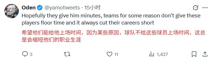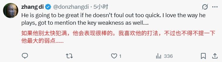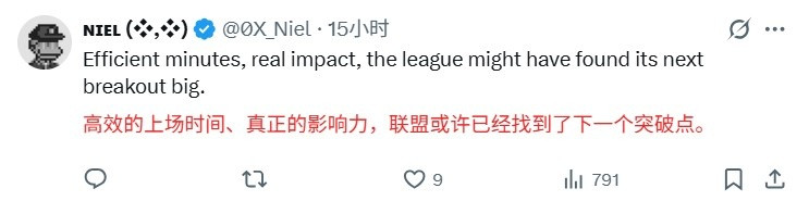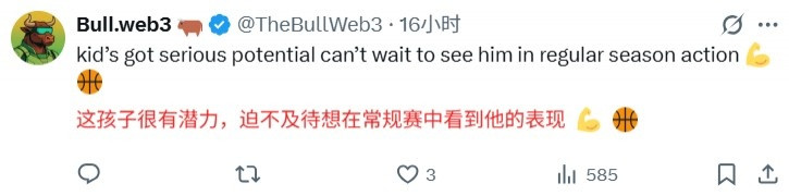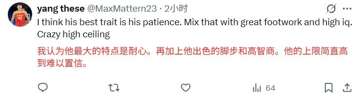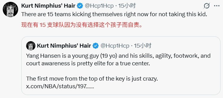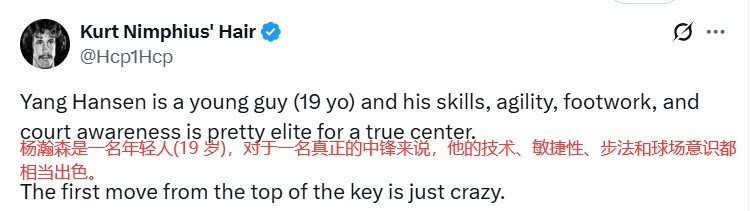 NBA officials previously posted highlights of Yang Hansen's preseason performance and average data, writing: "Yang Hansen's preseason performance is eye-catching!", which triggered heated discussions among American netizens.