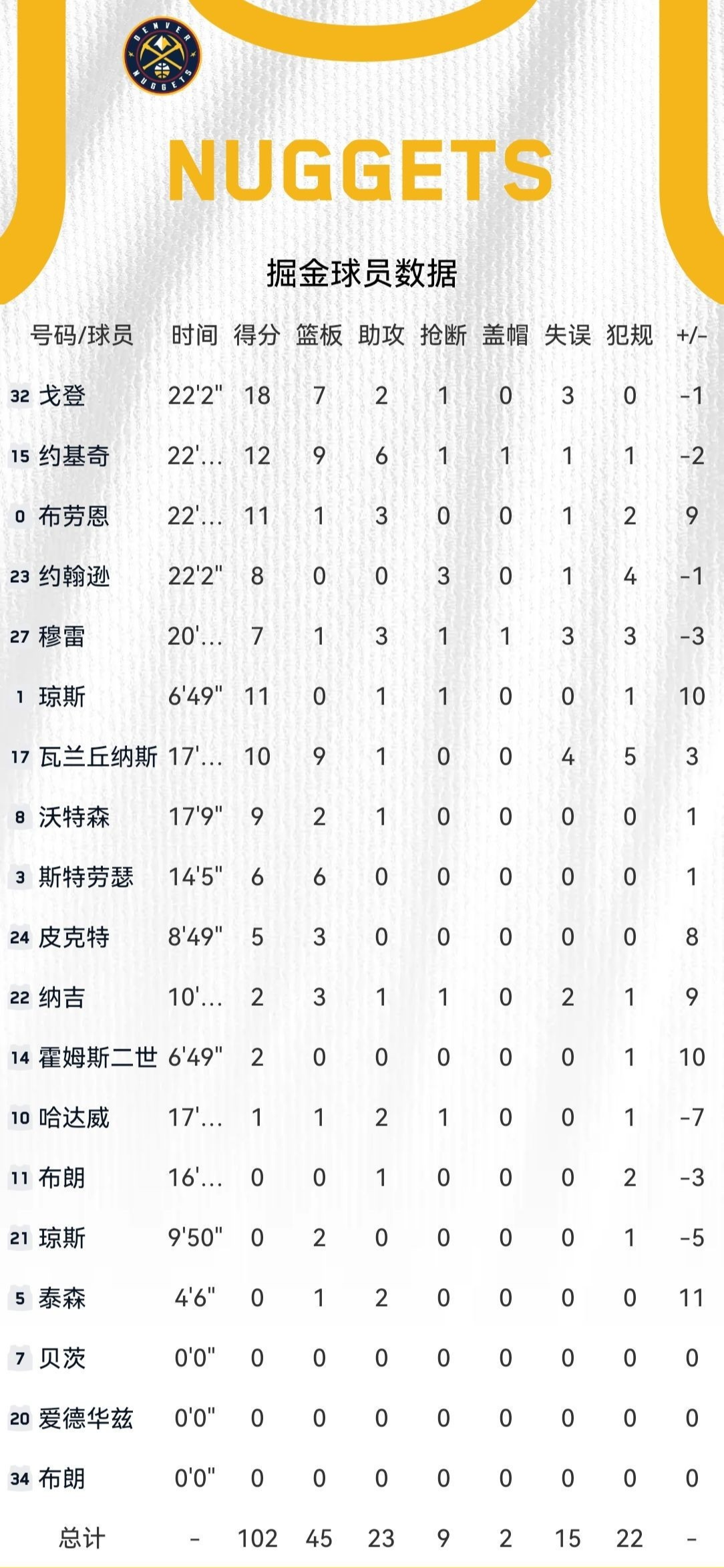 Teacher Yue, the core of the Nuggets, contributed 12 points, 9 rebounds and 6 assists. Gordon had 18 points, 7 rebounds and 2 assists. He is still a strong point for the Clippers. Braun contributed 11 points, 1 rebound and 3 assists. Murray had 7 points, 1 rebound and 3 assists, Johnson had 8 points, but had 3 steals on the defensive end.