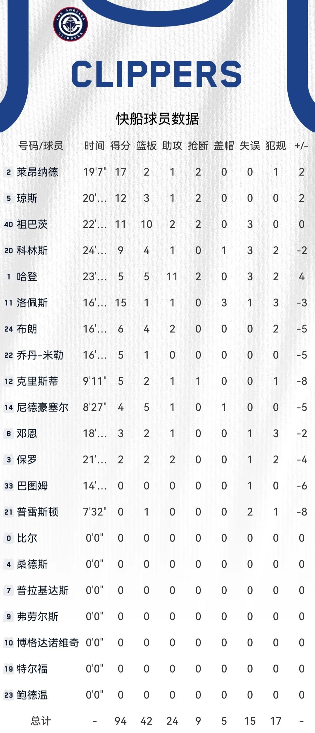 In the third quarter, the Clippers changed sides and fought again. The Clippers' offense was blocked and they lost by 3 points at 14:17 in a single quarter. In the fourth quarter, after the Clippers' main force was removed, the offensive end still failed to improve and lost another 7 points at 19:26. The Clippers played quite passively in the second half. After the final four quarters, the Clippers lost to the Nuggets 94:102, failing to avenge their elimination in the tiebreaker in the playoffs.