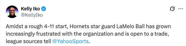 On November 21, according to the famous reporter Iko, multiple league sources revealed that after the Hornets lost disappointingly to the Pacers with only 2 wins and 13 losses in the away game (suffering four consecutive losses, the record dropped to 4 wins and 11 losses, ranking 12th in the Eastern Conference), star guard LaMelo Ball (three goals) has become increasingly dissatisfied with the team and is willing to be traded away from the team.