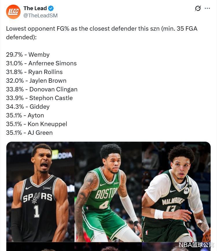 It is worth noting that Bunyama also ranks first in the league in two statistics. 1. Wenban Yama averaged 4.8 blocks per game, ranking first in the league. Second, the US media The Lead listed a defensive statistic, ranking the players with the lowest field goal percentage (defending at least 35 shots) when defending against each other this season, with Bunyama (29.7%) ranking first.