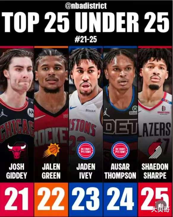 23rd place is Jaden Ivy. As a No. 5 pick, Ivy's performance in the early stage of his career has met expectations, but if he wants to go further, he needs to stay healthy. 24th place is Olsa Thompson. Both of them are talented by the Pistons. Olsa is also the No. 5 pick. If it weren't for the injury that made him miss many games, his ranking might be higher. The 25th is Sharp, who is like Jaylen Green, with talent visible, but his growth rate is disappointing.