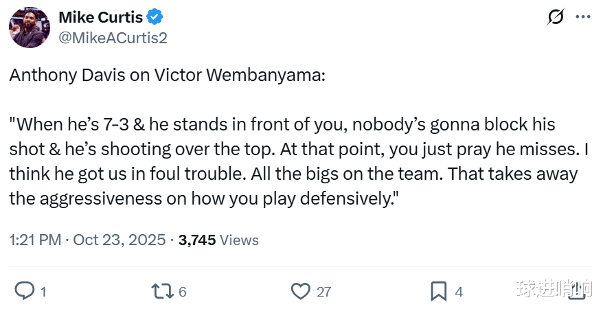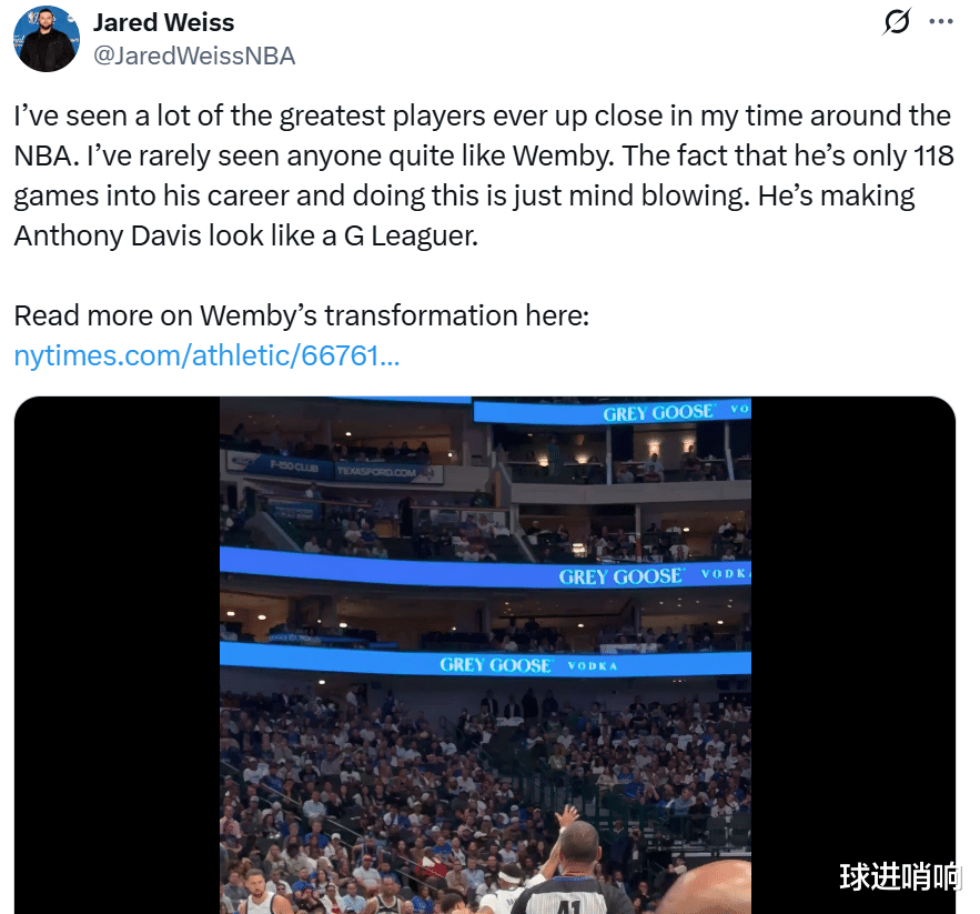 American reporter Jared Weiss also wrote about Wenban Yama's horrific debut performance. He said frankly that he has watched many NBA players play, but he has never seen such a rare existence as Wenban. He only played 118 games, and he made the opponent with thick eyebrows look like a G League player.