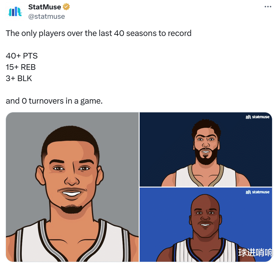 The second Wenban player has become the third player in the past 40 years to hand over at least 40 points, 15 rebounds and 3 blocks in a single game, while making zero turnovers. The first two are Brother Big Eyebrow and O'Neal.