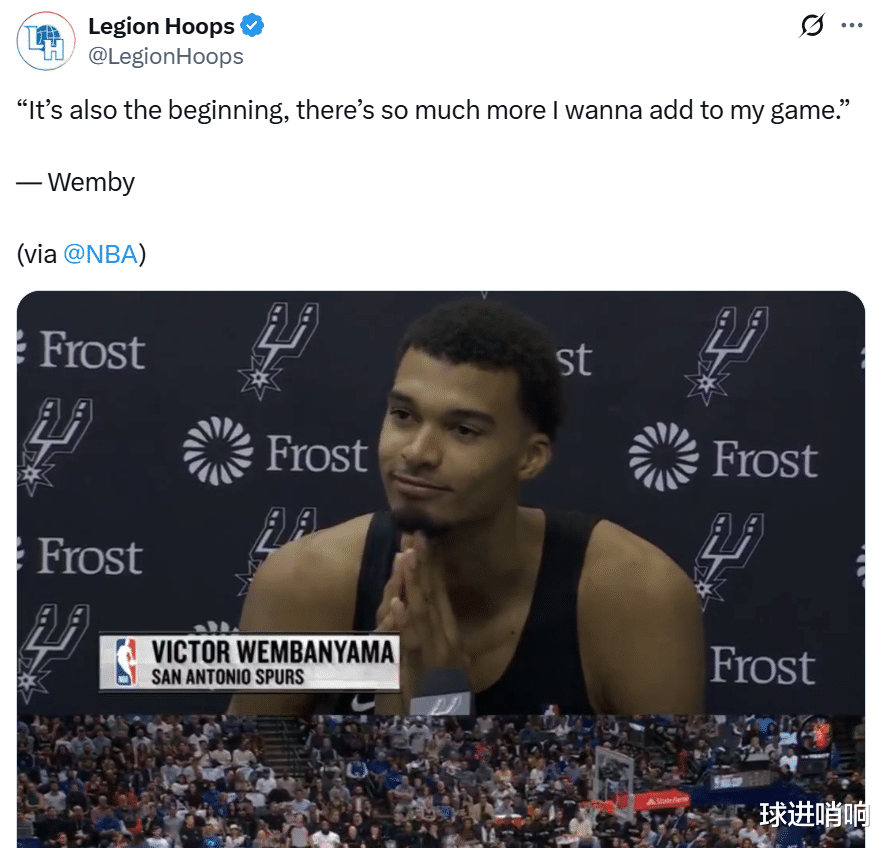 During the period, Wenbanyama also talked about going to the Shaolin Temple to train during the offseason. He admitted that this experience improved his physical function, and that special training with Olajuwon improved his offensive ability. Moreover, these experiences have helped him far beyond basketball itself.