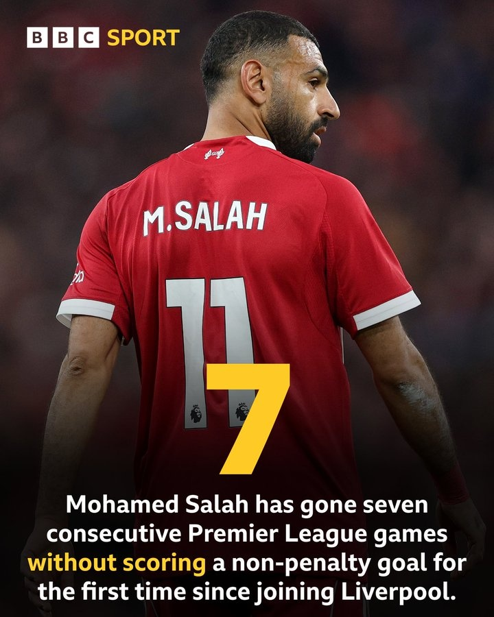 According to BBC statistics, Salah failed to score a non-penalty goal in 7 consecutive Premier League games. This is the first time he has encountered this situation since joining Liverpool.