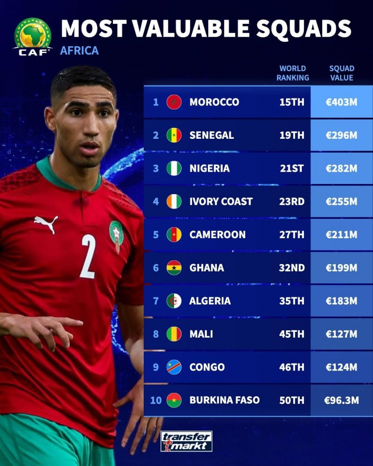 On October 12, the German Transfer Market Network updated the CAF national team value rankings. The 2022 World Cup semi-final team Morocco topped the list with a total value of 403 million euros, followed by Senegal (296 million euros) and Nigeria (282 million euros) in second and third place.
