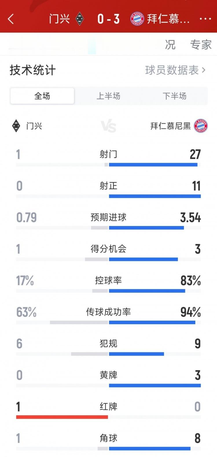 Bayern 3-0 Monchengladbach full-time statistics: 27-1 shots, 11-0 shots on target, Bayern s ball possession rate exceeds 80%