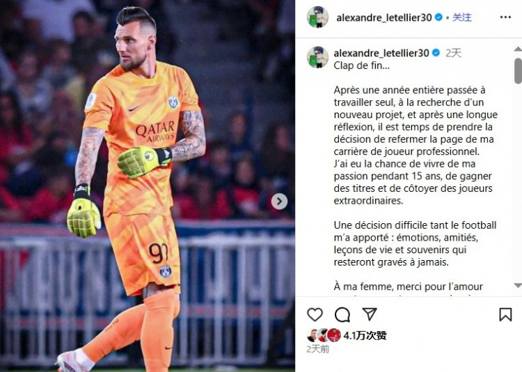 End of 15-year career! Official: Former Paris Saint-Germain goalkeeper Letelier retires at the age of 34