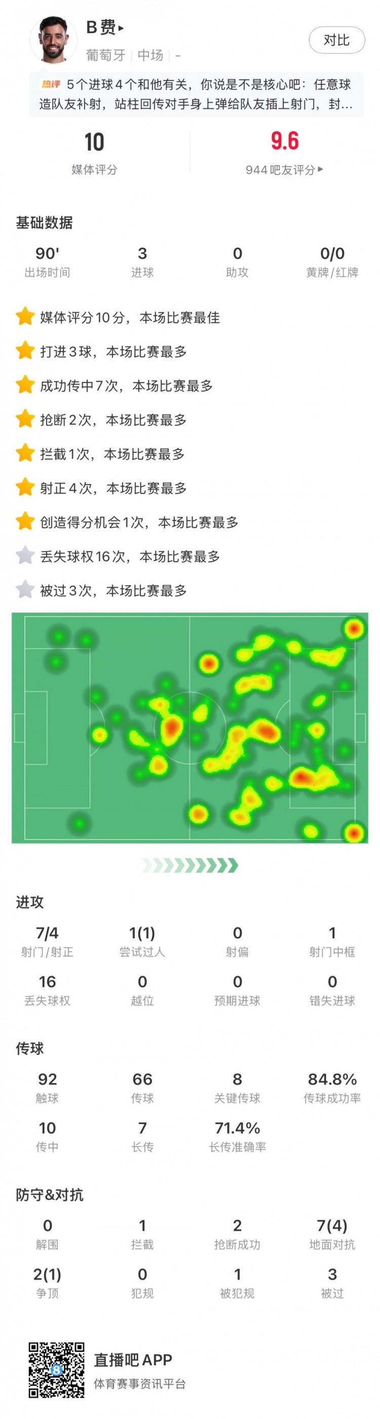 Full score! B fee data: 7 shots and 4 shots on target, passing success rate 85%, 8 key passes