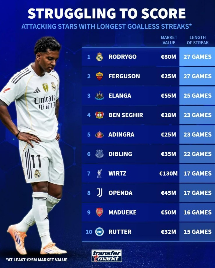 On November 8th, Xunde Zhuan counted the attackers who are currently experiencing a goal drought. Among them, Rodrigo topped the list with 27 consecutive games. The following are the specific situations (only players worth more than 25 million euros are counted):