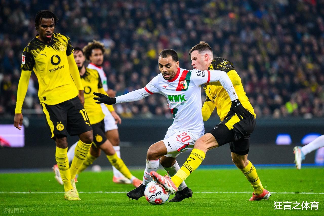 The two teams played a bit boringly again, but the fans at the scene were very happy and happily exploded fireworks. In the 53rd minute, Dortmund pressed on from the left. Brandt took the ball from the front of the penalty area and broke away from the defense. Then he shot vigorously with his right foot. The ball slightly missed the far post. Three minutes later, Dortmund quickly counterattacked from the center. Chukwu Emeka dribbled the ball to the top of the penalty area and shot hard with his left foot. The ball was slightly above the crossbar and went out of the baseline. In the 70th minute, Augsburg made a fast break in the middle. Saad made a clever pass in front of the top of the penalty area. Rex Beka broke into the penalty area and was about to get a super close shot. Bellingham, who had just come on as a substitute, returned to the defense and made a timely clearance. After that, Augsburg was no longer able to create murderous opportunities. In the end, Dortmund defeated Augsburg 1:0 in an away game and won 2 consecutive victories.