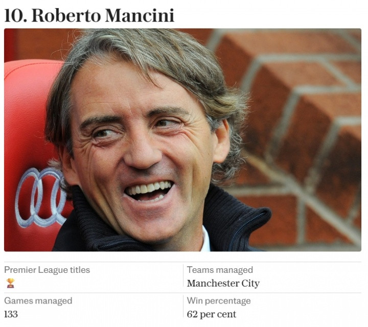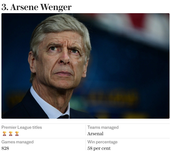 The Telegraph evaluated the top ten coaches in the history of the Premier League↓
