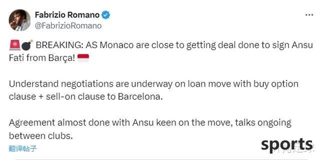 Fati agreed to join Monaco on loan, and the agreement was basically reached. Monaco and Barcelona only need to finalize the last details and the transfer can be completed.